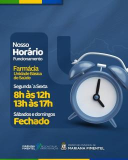 A Prefeitura informa que, a partir de 1º de janeiro de 2026, o horário de funcionamento da Farmácia da UBS será: