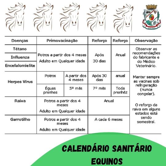 A Secretaria de Agricultura através do Setor Veterinário em parceria com a Inspetoria Veterinária e a EMATER ASCAR compartilha com nossos produtores o Calendário Sanitário para Equinos, calendário regional.