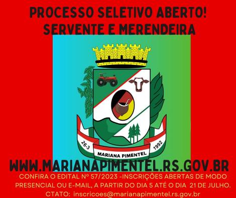 A prefeitura de Mariana Pimentel através da Comissão Permanente (CP), que conduz os processos seletivos simplificados torna público aos interessados em compor o quadro do setor público municipal, que já estarão abertas, a partir desta quarta-feira (5), até o dia (21), deste mês, o prazo estabelecido no Edital nº 57/2023, para o preenchimento de vagas de servente e de merendeira.