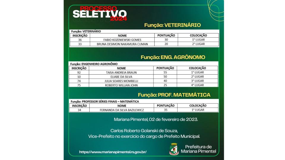 RESULTADO FINAL ETAPA 02, da pontuação dos candidatos inscritos no Processo Seletivo Simplificado, regido pelas normas estabelecidas no Edital n°. 01/2024, retificado pelo edital n° 03/2024 e 05/2024 e no De-creto n°. 1.679, de 21 de julho de 2022, conforme relacionados:
