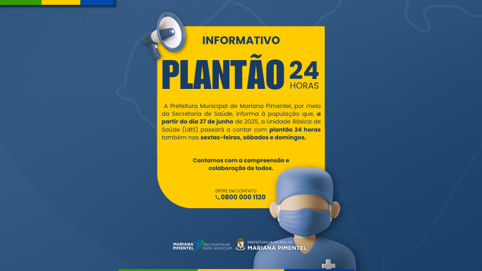 A Prefeitura Municipal de Mariana Pimentel, por meio da Secretaria de Saúde, informa à população que, a partir do dia 27 de junho de 2025, a Unidade Básica de Saúde (UBS) passará a contar com plantão 24 horas nas sextas-feiras, sábados e domingos.