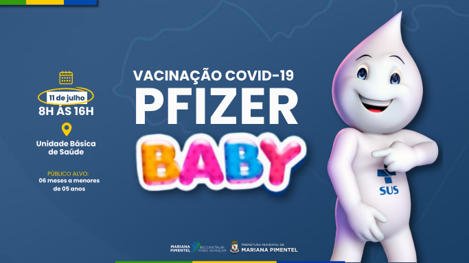 Atenção, pais e responsáveis!No dia 11 de julho, das 8h às 16h, a Unidade Básica de Saúde realizará a vacinação contra a COVID-19 com o imunizante Pfizer Baby.📌 Público-alvo: crianças de 6 meses a menores de 5 anos.