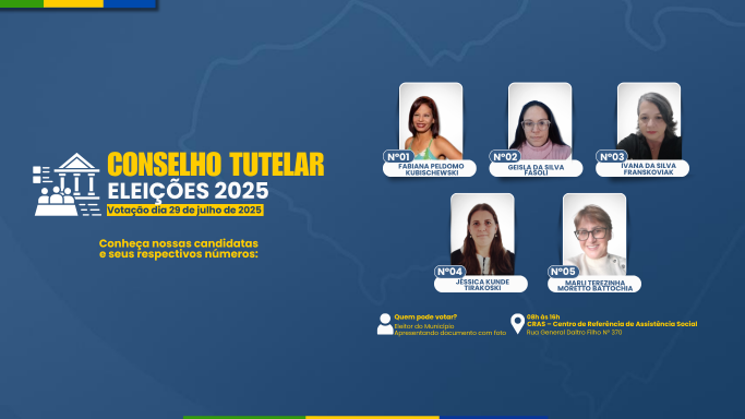 Prefeitura Municipal de Mariana Pimentel convida os eleitores do município a participarem da Eleição para o Conselho Tutelar, que será realizada no dia: 🗓 29 de julho de 2025 (terça-feira) 🕗 Das 08h às 16h 📍 CRAS – Centro de Referência de Assistência Social 📌 Rua General Daltro Filho, nº 370 A eleição é uma importante ferramenta de participação popular na escolha das representantes que atuarão na proteção dos direitos das crianças e adolescentes. Para votar, é necessário ser eleitor do município e apresentar documento oficial com foto. Conheça as candidatas e participe!