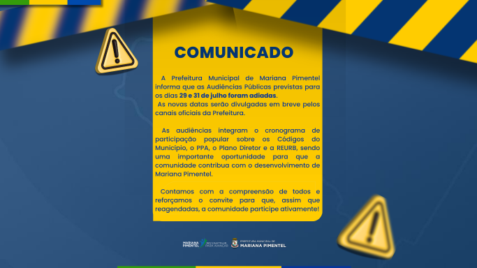 A Prefeitura Municipal de Mariana Pimentel informa que as Audiências Públicas previstas para os dias 29 e 31 de julho foram adiadas. As novas datas serão divulgadas em breve pelos canais oficiais da Prefeitura. As audiências integram o cronograma de participação popular sobre os Códigos do Município, o PPA, o Plano Diretor e a REURB, sendo uma importante oportunidade para que a comunidade contribua com o desenvolvimento de Mariana Pimentel. Contamos com a compreensão de todos e reforçamos o convite para que, assim que reagendadas, a comunidade participe ativamente!