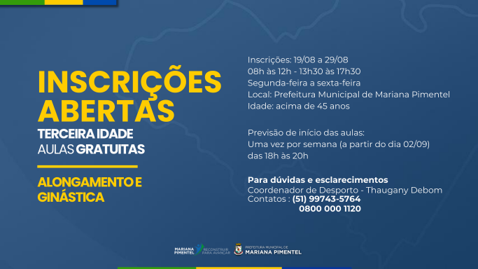 A Prefeitura Municipal de Mariana Pimentel informa que estão abertas as inscrições para as aulas gratuitas de alongamento e ginástica, destinadas à terceira idade. A iniciativa busca promover qualidade de vida, bem-estar e saúde para a nossa comunidade. 📅 Período de inscrições: 19 a 29 de agosto 🕗 Horário: das 8h às 12h e das 13h30 às 17h30 (de segunda a sexta-feira) 📍 Local: Prefeitura Municipal 👥 Público: pessoas acima de 45 anos 📆 Início das aulas: a partir de 02 de setembro 🕕 Frequência: uma vez por semana, das 18h às 20h, no Ginásio Municipal. ℹ️ Para mais informações, entre em contato pelo telefone (51) 99743-5764 ou pelo número 0800 000 1120. ✨ Participe e venha cuidar da sua saúde com a gente!