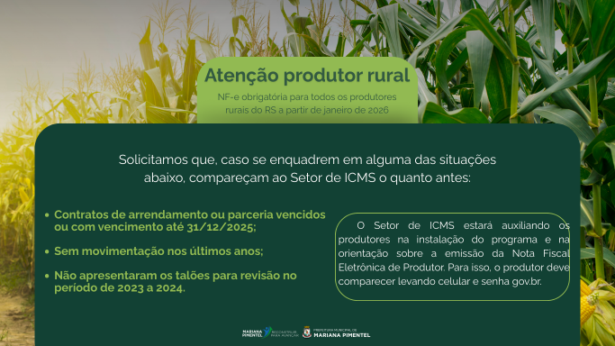 Senhores Produtores Rurais Devido à obrigatoriedade da emissão de Nota Fiscal Eletrônica a partir de janeiro de 2026, solicitamos que, caso se enquadrem em alguma das situações abaixo, compareçam ao Setor de ICMS o quanto antes: • Contratos de arrendamento ou parceria vencidos ou com vencimento até 31/12/2025; • Sem movimentação nos últimos anos; • Não apresentaram os talões para revisão no período de 2023 a 2024. O Setor de ICMS estará auxiliando os produtores na instalação do programa e na orientação sobre a emissão da Nota Fiscal Eletrônica de Produtor. Para isso, o produtor deve comparecer levando celular e senha gov.br. A partir de 5 de janeiro de 2026, a obrigatoriedade da NF-e e da NFC-e em operações internas passa a valer para todos os produtores rurais do RS, independentemente do faturamento. No caso de operações interestaduais, a nota eletrônica já é obrigatória para todos os produtores do RS. A solução recomendada pela SEFAZ para a emissão da NF-e e da NFC-e é o aplicativo Nota Fiscal Fácil (NFF), que pode ser baixado gratuitamente no celular e acessado com o login gov.br.