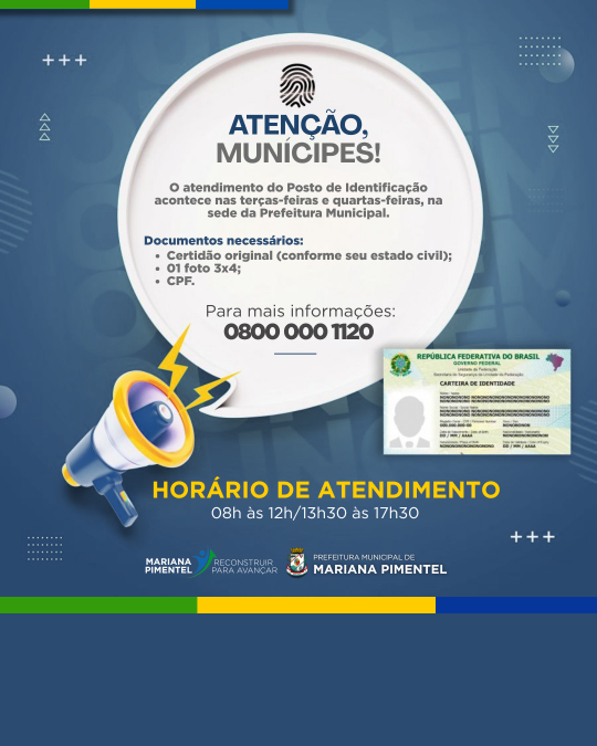 ATENÇÃO, MUNÍCIPES! O atendimento do Posto de Identificação acontece nas terças e quartas-feiras, na sede da Prefeitura Municipal. Documentos necessários: Certidão original (conforme seu estado civil); 01 foto 3x4; CPF. Também podem ser incluídos: Cartão do SUS, PIS/PASEP, Carteira de Trabalho, Habilitação, Título Eleitoral, tipo sanguíneo (comprovado por exame de laboratório) e condições específicas de saúde (comprovadas com atestado médico). Valores: 1ª via: isenta 2ª via: R$ 95,03