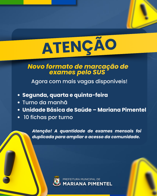 Novo formato de marcação de exames laboratoriais pelo SUS em Mariana Pimentel A Prefeitura de Mariana Pimentel, por meio da Secretaria Municipal da Saúde, informa à comunidade que o sistema de marcação de exames laboratoriais pelo SUS passará a funcionar em um novo formato, com o objetivo de organizar melhor o atendimento e garantir um serviço mais ágil e eficiente para todos os usuários. A partir de agora, serão disponibilizadas 10 fichas para marcação de exames laboratoriais em três dias da semana — segunda, quarta e quinta-feira, sempre no turno da manhã. Além disso, a Prefeitura anuncia que a quantidade total de exames ofertados mensalmente será duplicada, ampliando o acesso da população aos serviços laboratoriais e reduzindo o tempo de espera para atendimento. As marcações devem ser realizadas diretamente na Unidade Básica de Saúde, mediante apresentação do pedido médico e do cartão SUS. As fichas serão distribuídas por ordem de chegada, respeitando a quantidade limitada por dia. Com essa nova organização, a Secretaria busca evitar filas e longas esperas, além de otimizar o fluxo de agendamentos, garantindo que todos os pacientes possam realizar seus exames dentro do cronograma previsto. Após a retirada da ficha e autorização na Unidade Básica de Saúde, o paciente deve seguir o mesmo procedimento já adotado anteriormente — levar a via ao Laboratório, realizar os exames e, posteriormente, retornar à Unidade Básica de Saúde com os resultados, para que o médico possa avaliá-los e incluí-los em seu prontuário. A Prefeitura reforça que essa mudança tem como principal objetivo melhorar o atendimento à população, tornando o processo mais claro, rápido e organizado. 📍 Unidade Básica de Saúde de Mariana Pimentel 🕗 Atendimento para retirada das fichas: segunda, quarta e quinta-feira – turno da manhã Em caso de dúvidas, a equipe da UBS está à disposição para orientar e prestar esclarecimentos.