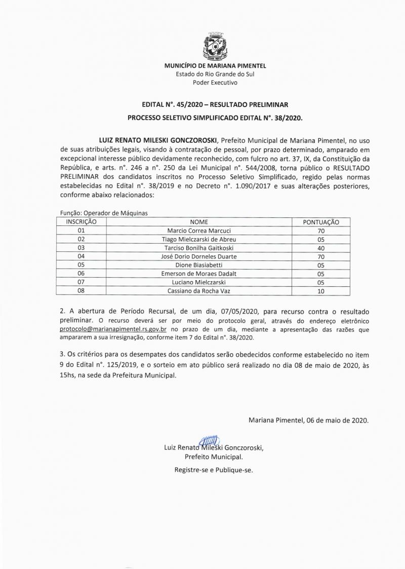 LUIZ RENATO MILESKI GONCZOROSKI, Prefeito Municipal de Mariana Pimentel, no uso de suas atribuições legais, visando à contratação de pessoal, por prazo determinado, amparado em excepcional interesse público devidamente reconhecido, com fulcro no art. 37, IX, da Constituição da República, e arts. n°. 246 a n°. 250 da Lei Municipal n°. 544/2008, torna público o RESULTADO PRELIMINAR dos candidatos inscritos no Processo Seletivo Simplificado, regido pelas normas estabelecidas no Edital n°. 38/2019 e no Decreto n°. 1.090/2017 e suas alterações posteriores, conforme abaixo relacionados: