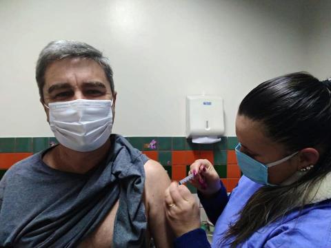 Nosso vice-prefeito, Betinho Golanski recebendo a 1° dose da Oxford/aztrazeneca, marcando o início da vacinação para o público em geral de 45 anos para cima, 45+.