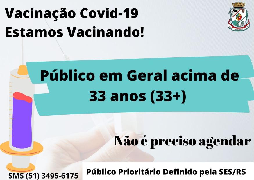 O Setor de Vacinas da Unidade Sanitária de Mariana Pimentel informa as vacinas contra a Covid-19 estão disponíveis para diversos grupos prioritários - público-alvo - já inseridos no esquema vacinal contra a Covid-19, e nesta semana avançamos na faixa etária, para 33 anos pra cima 33+.