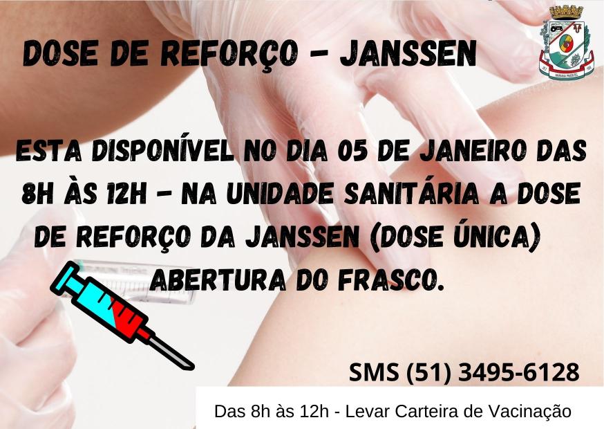 Dose de reforço da Janssen (dose única) disponível neste dia 05 de janeiro, das 8h às 12h.
